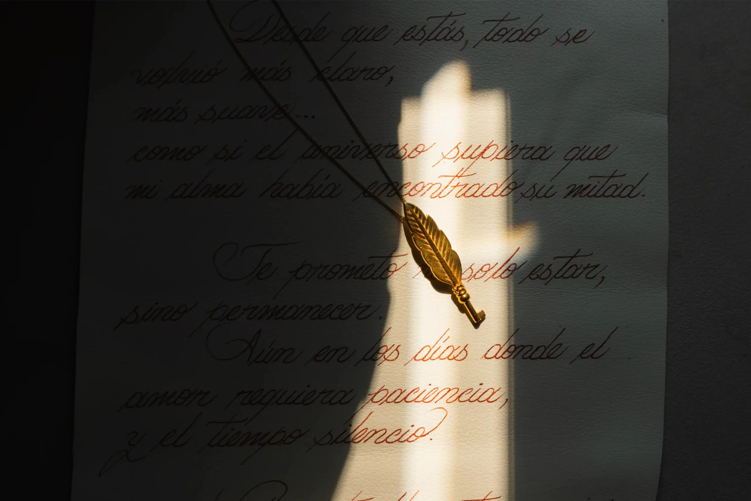 La Llave, una joya fina, abre un pergamino que resguarda una carta escrita a mano con arte caligráfico.
